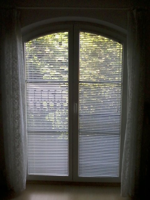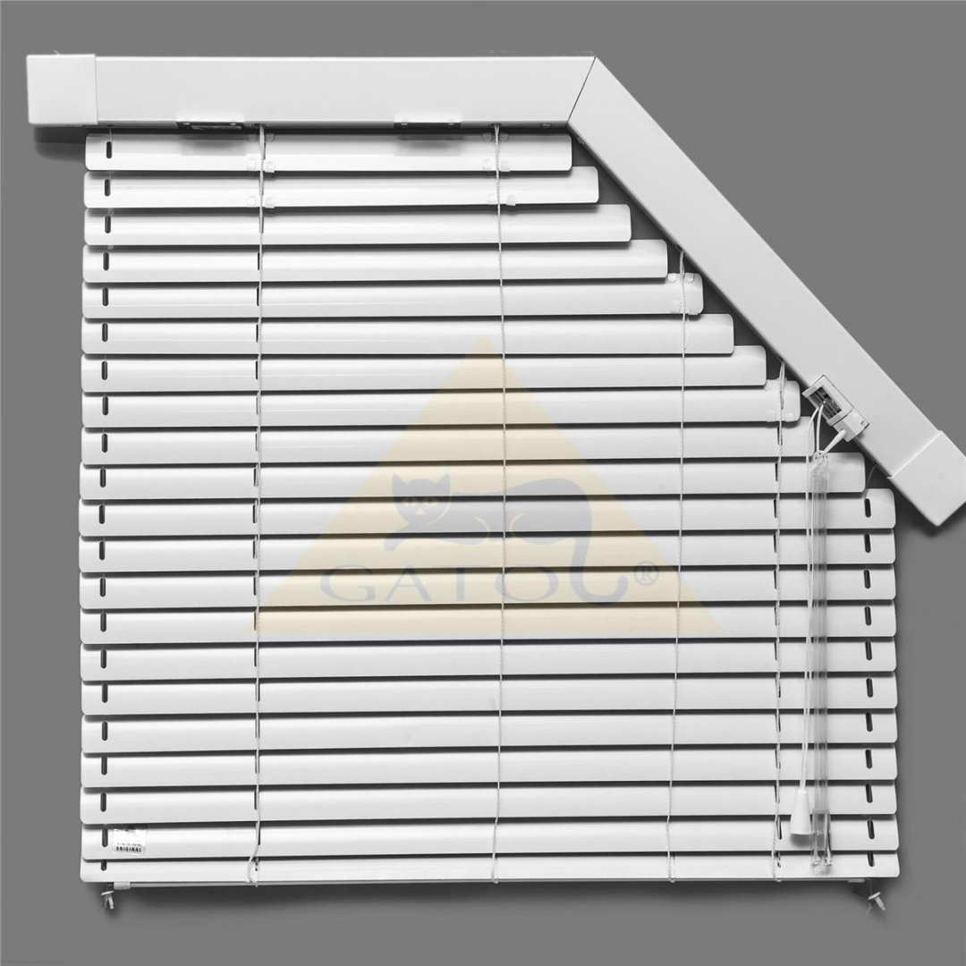 Horizontální žaluzie atypická typ: IS. Ovládání čelně plastovou tyčkou a šňůrkou.